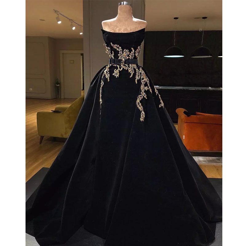 Graceful Black Velvet Evening Dresses Strapless Sashes Golden