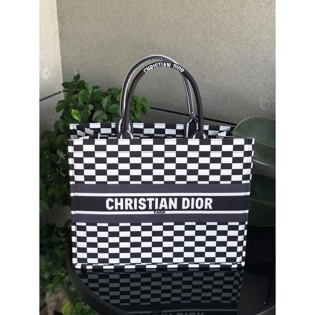 Dior Book Tote In Checker Embroidered Canvas Black White Shopee