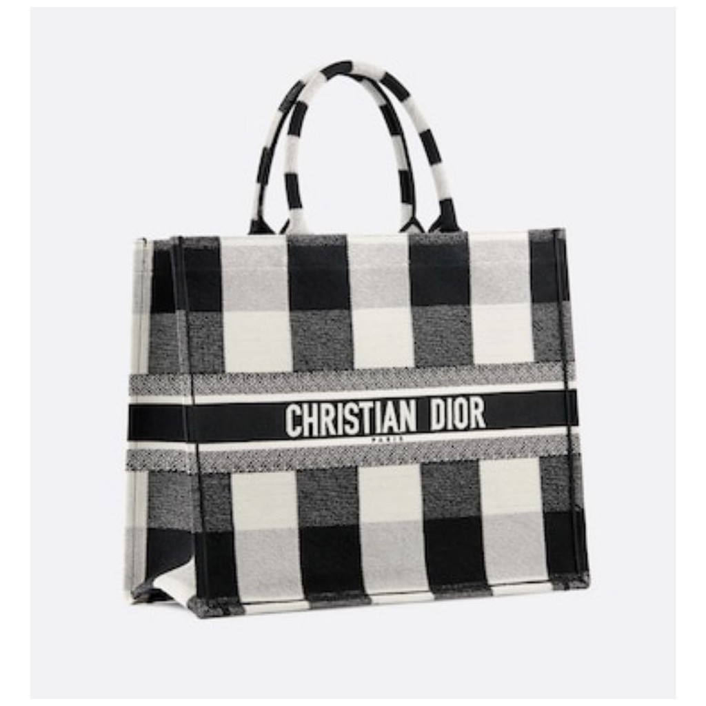 Dior Book Tote Bag In Black And White Plaid Embroidered Canvas