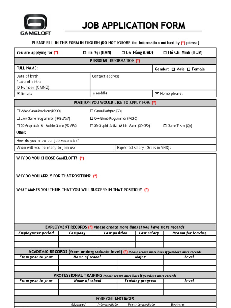 Gameloft Job Application Form Computing Platforms Areas Of
