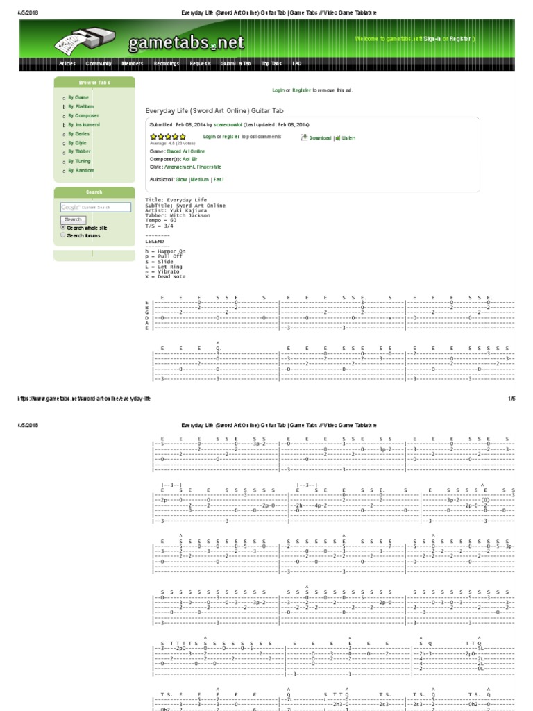 Everyday Life Sword Art Online Guitar Tab Game Tabs Video